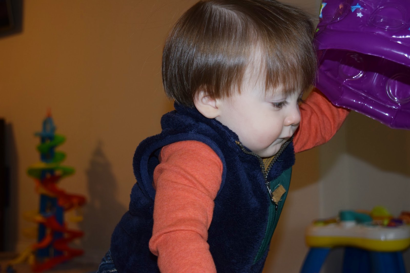 You really enjoy walks outside on your tricycle, so when the weather is nice I take you out on walks. You love airplanes and point to them anytime you see them flying over us when we’re walking. If your shoes are near you, you try to put them on. You also love kicking your soccer ball and saying “ball”.