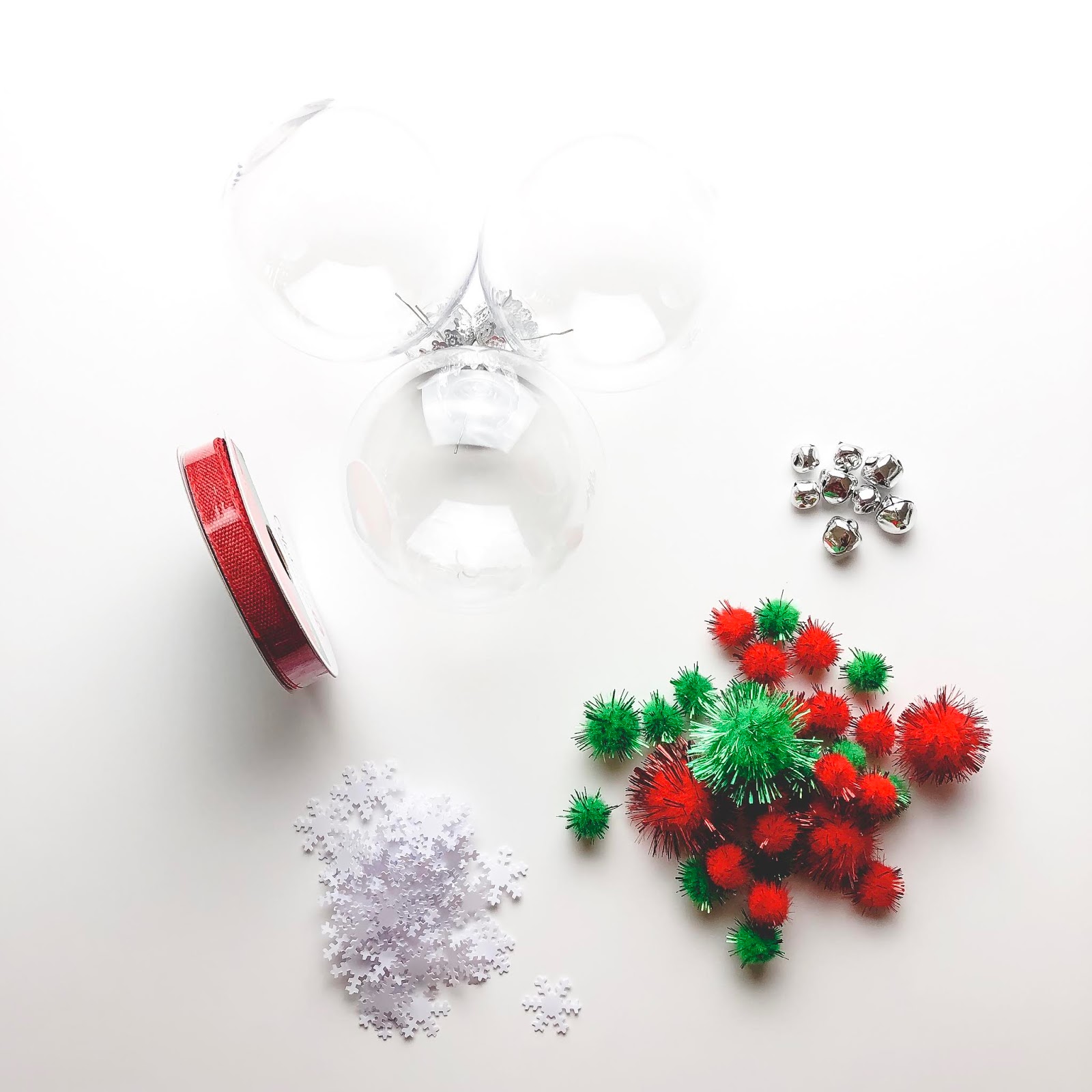 You’ll also need some fun things to place inside of the ornaments. They do look pretty with nothing in them too. You can put glitter, fake snow (so pretty), confetti, pom poms, sequins or bells. For the sake of not creating a giant mess to clean up, I stuck with confetti, felt balls, and bells.